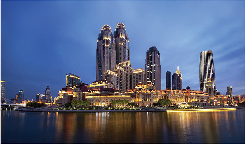 津?yàn)硰V場(chǎng)位于天津市和平區(qū)的一處海河河灣南岸,為緊鄰海河、面向天津站的歐式建筑群。建筑面積17.1萬平米,由5座歐式風(fēng)格的地上商業(yè)建筑及地下商業(yè)街、停車場(chǎng)共同構(gòu)成。其建筑風(fēng)格與周邊原租界內(nèi)的歷史建筑一致,為天津金融城的標(biāo)志性區(qū)域。